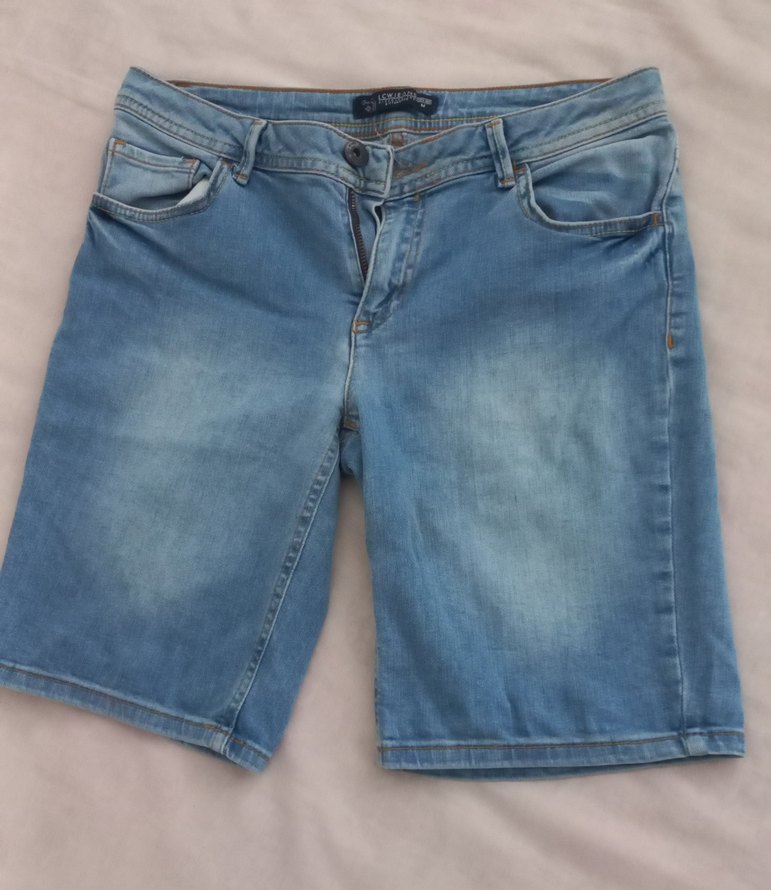 Kadınlar için normal kesim ve midi boyda yumuşak denim kumaştan mavi-gri tonlarda şort. Günlük kullanıma uygun çok az giyildi
