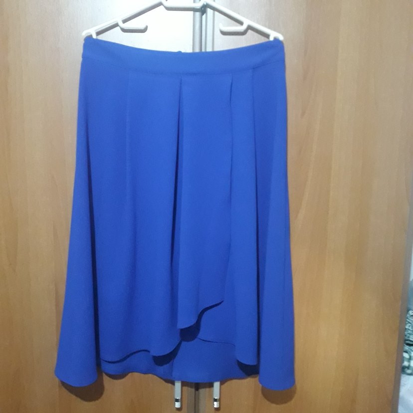 Mavi midi boy, drapeli ve bol kesim kadın etek. Yumuşak sentetik kumaştan, desen içermeyen koyu renk. 42 ye de rahatlıkla olur