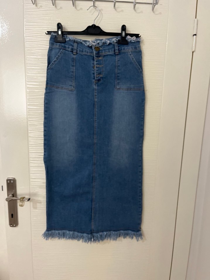Açık mavi kot kumaştan, kemerli ve salaş kesimli midi uzunlukta, salaş kenarlı günlük kullanıma uygun kadın eteği. Dar geldiği için giyemiyorum fazla kullanılmadı