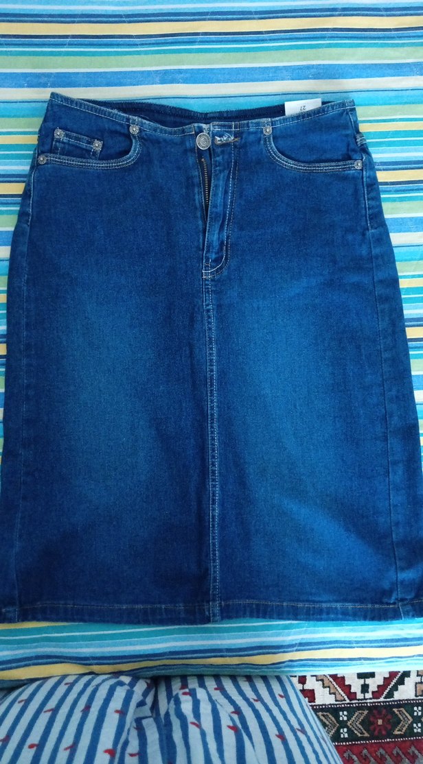 Koyu mavi denim midi etek, rahat kesimiyle gündelik kullanıma uygun, çabasız şıklık sunar.