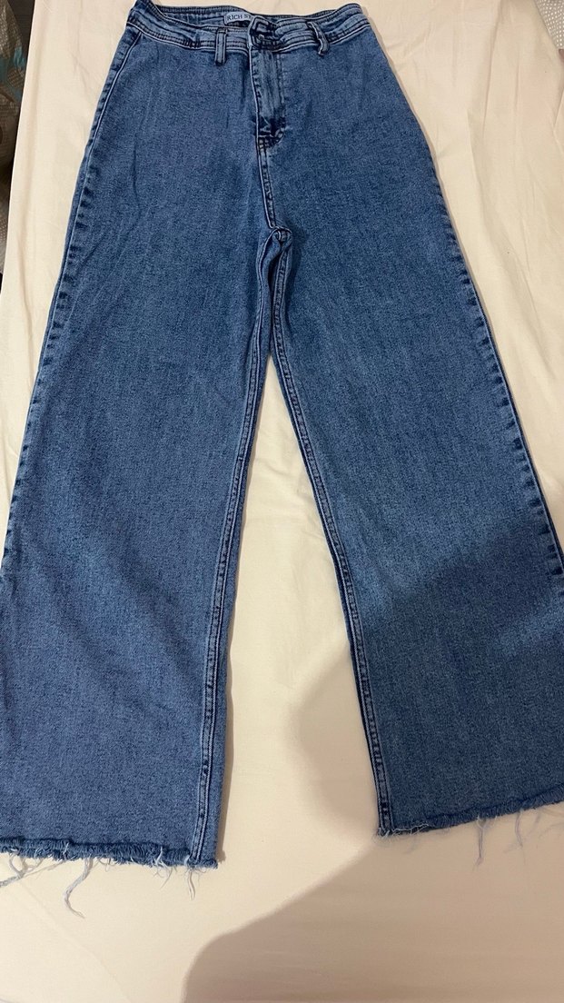 Mavi midi uzunlukta, rahat kesim ve desensiz kot pantolon. Parlak görünümlü, günlük kullanım için zahmetsiz şıklık sunar. LİKRALI