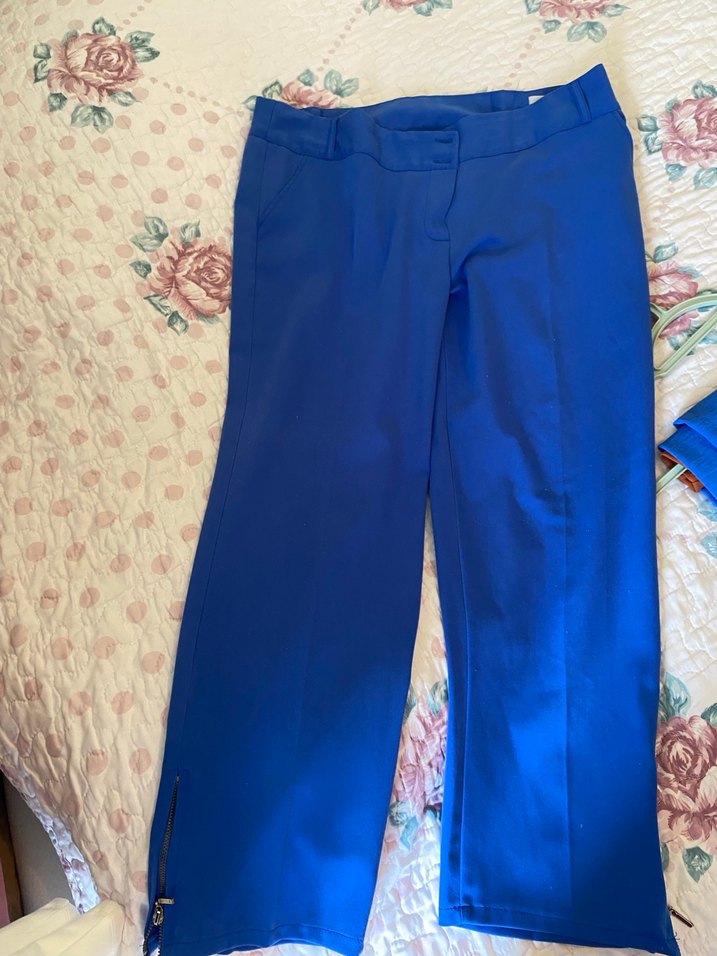 Kadınlar için koyu mavi midi boy, regular fit kumaş pantolon. Alt kısımda fermuar detayı bulunur, iş ve günlük sokak stiline uygundur. Pamuklanma var