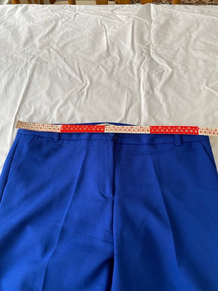 Kadınlar için mavi, midi boy, kemerli kumaş pantolon. Minimalist, normcore tarzda, ofis kullanımı için uygun, renklidir ve desensizdir. Avant-garde modaya uygundur.