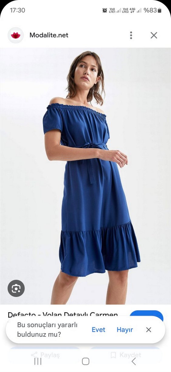 saks mavisimidi elbise, fırfır detaylı kayık yaka ve askılı kollara sahiptir. Bol kesim ve parlak keten kumaştan yapılmıştır, romantik akşamlar için uygundur.