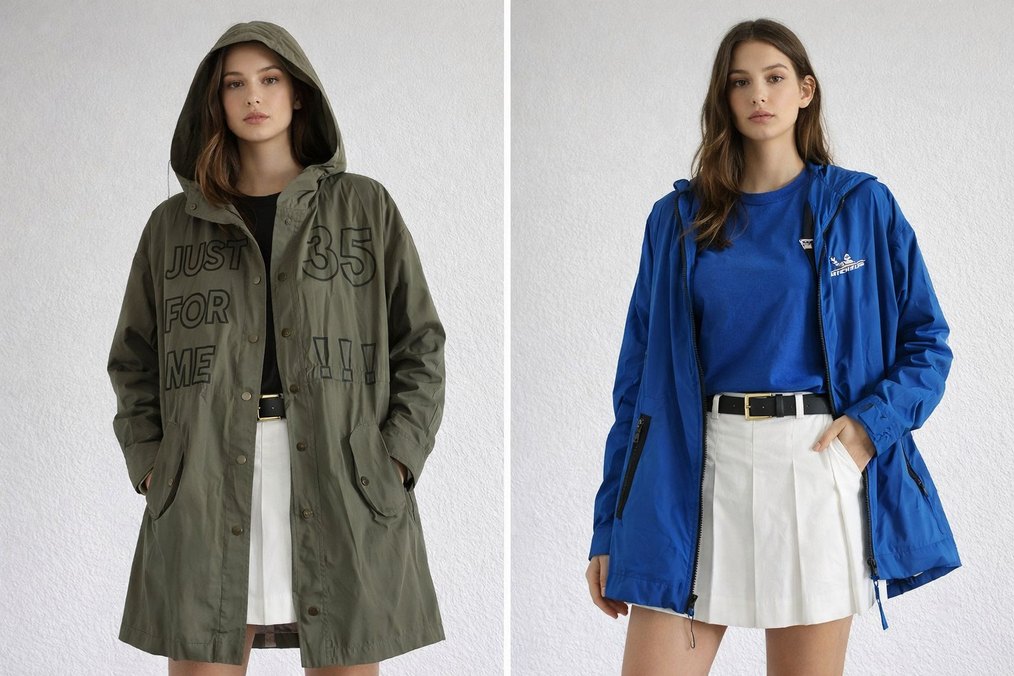 Kadın yağmurluk, kapüşonlu, midi boyda, bol kesim ve uzun kolludur. Sentetik kumaştan yapılmış, günlük kullanım için uygundur.