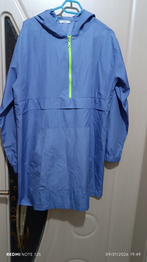 Kadın mavi yağmurluk, bol kesim ve midi boyda, yüksek yakalı ve uzun kolludur. Parlak sentetik kumaştan yapılmış, önde fermuarlı, dış mekan için uygundur. ️