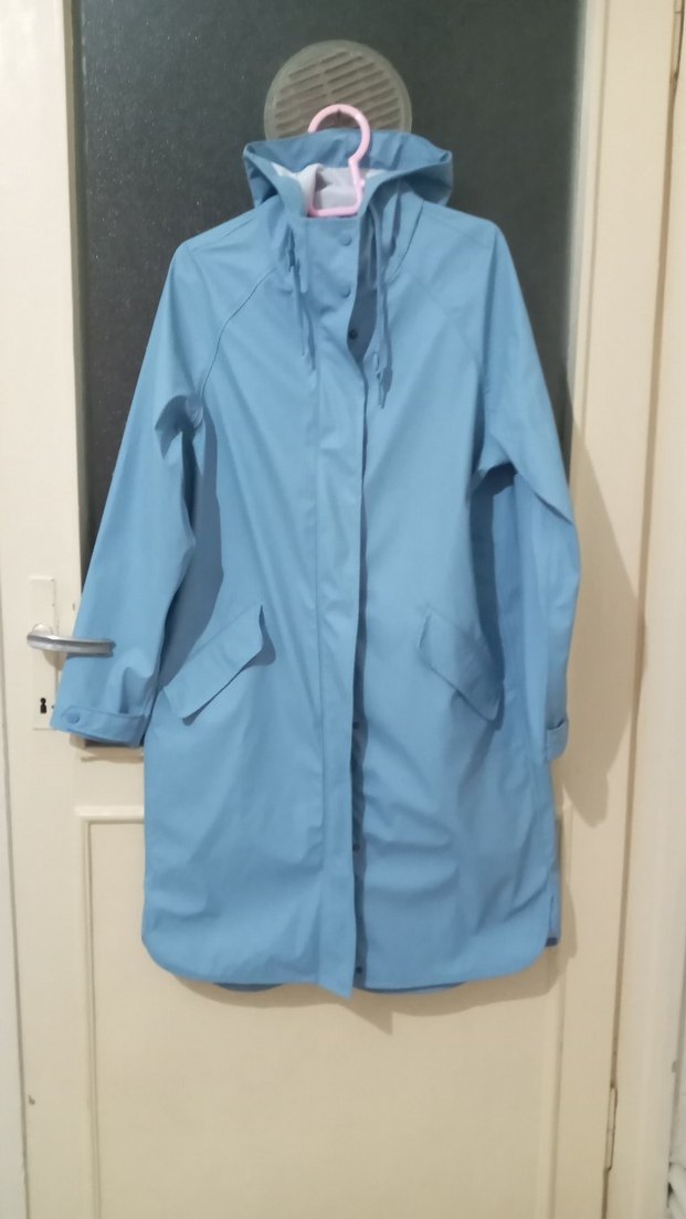 Kadın mavi yağmurluk, normal kesimdir. Sentetik kumaştan üretilmiş, uzun kollu ve minimalist tarzda, dış mekan kullanımı için uygundur. ️
