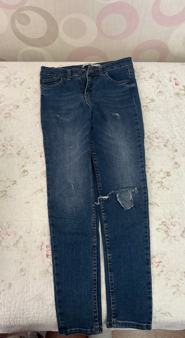Salaş kesim, yırtık detaylı mavi denim kadın kot pantolon. Midi boy ve günlük sokak stili için uygun.
