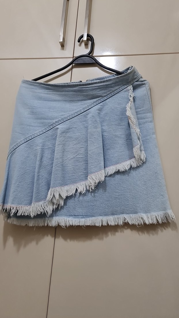 buz mavisi denim kumaştan, dar kadın mini etek. Püsküllü kenarları ve asimetrik sarma detayıyla gündelik sokak şıklığı için uygun.
