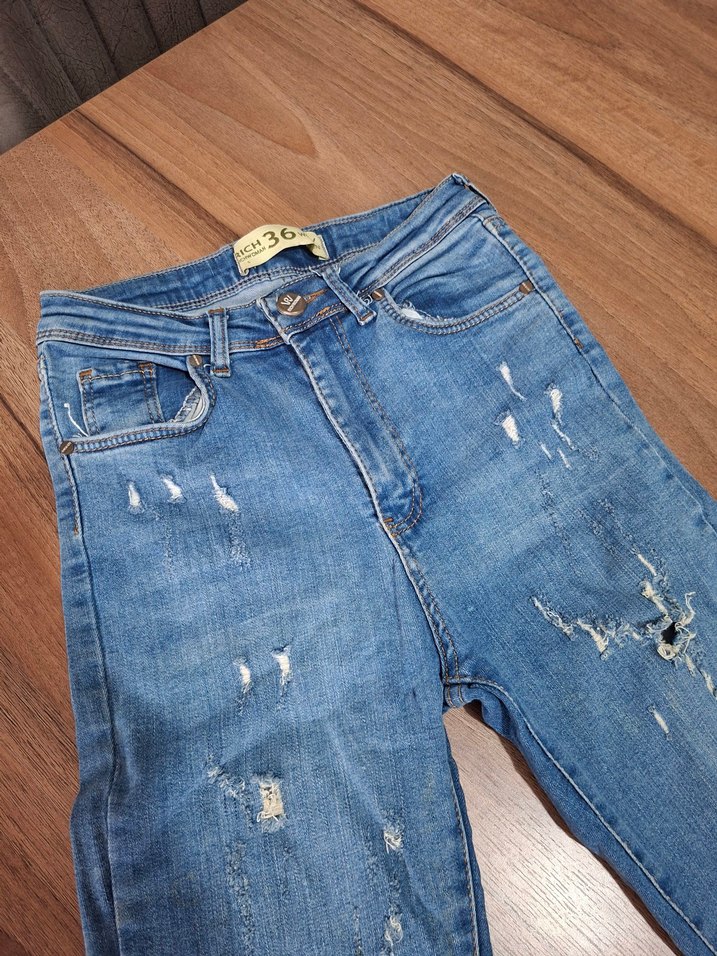 Kadınlar için mavi kot pantolon, regular fit ve mini boyda. Tokalı bel ve parlak baskılı, yırtık detaylı tasarıma sahip, rahat sokak tarzı için uygun.
