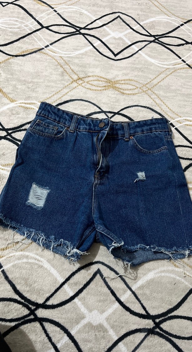 Koyu mavi renk, bol kesim mini denim şort. Etek ucu ve ön kısmında yıpranmış detaylar bulunur. Günlük kullanıma uygun.
