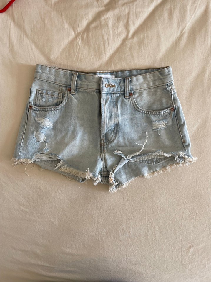 Mavi,rahat kesim mini denim şort. Günlük kullanıma uygun, sokak stiline uyumlu ve zahmetsiz şıklık sunar.
