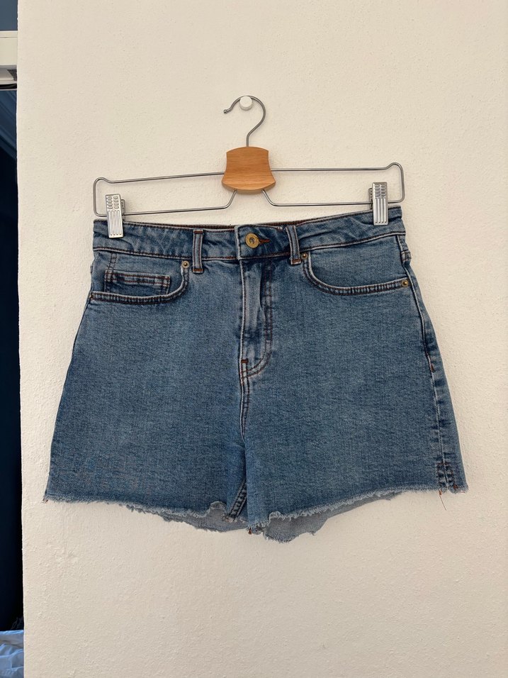 Günlük kullanım için rahat kesimli, paçası kesik mavi denim mini şort. Trendy ve salaş sokak stili için ideal.