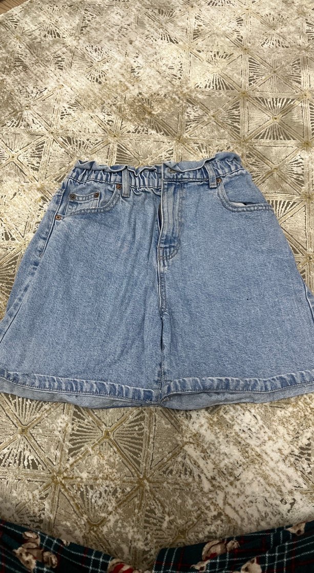Pastel mavi renkli, bel kısmı ve bol kesimiyle kadınlar için mini boy denim şort. Günlük sokak stili için uygundur.