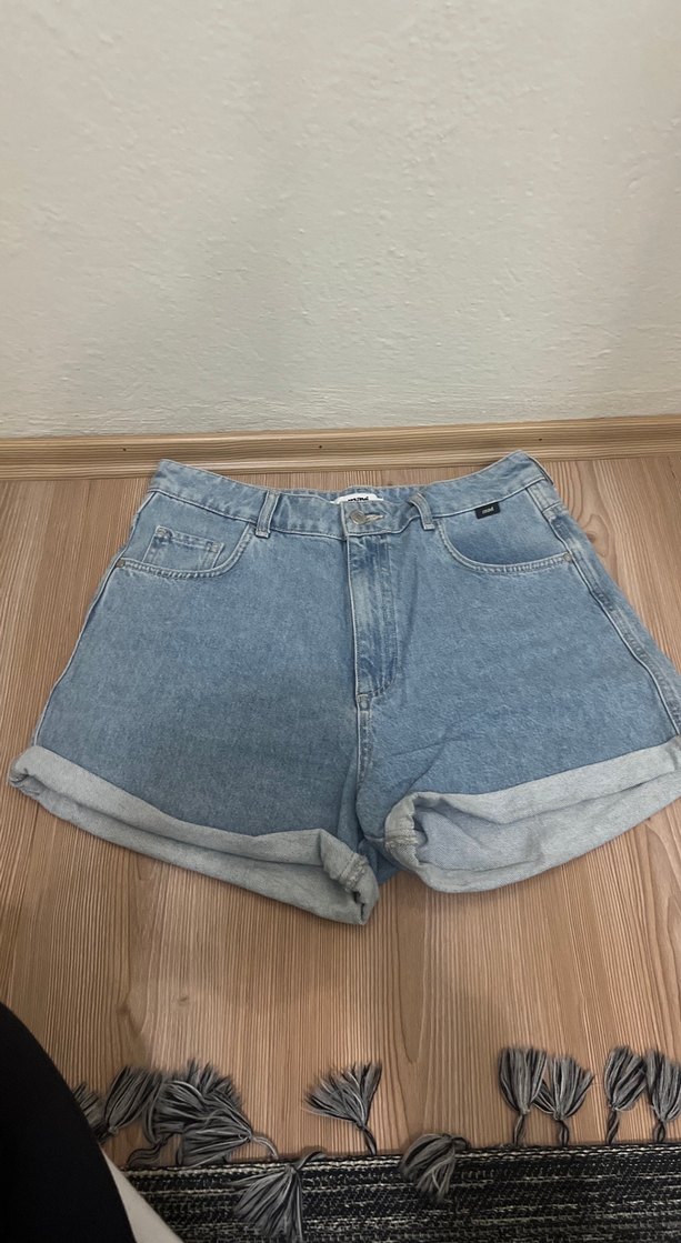 Kadınlar için pastel mavi renkte, bol kesim ve kısa boy mini denim şort. Günlük rahat kullanıma uygun, manşetli tasarımıyla zahmetsiz şıklık sunar. Dikişleri açılabilir, deforme yoktur. 28 beden 38 e eşittir