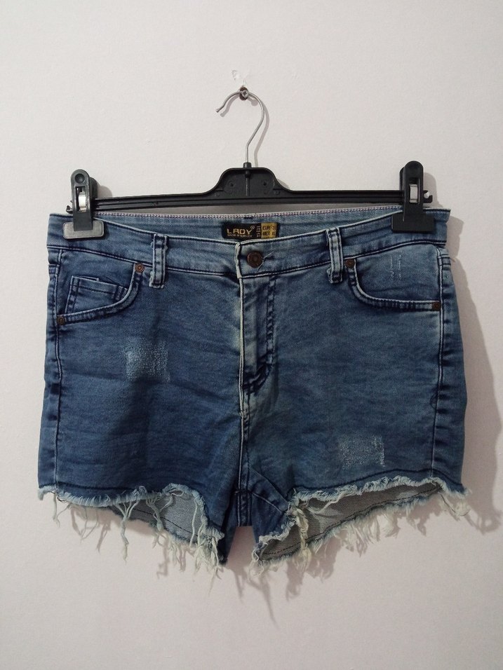 Gevşek kesim, tokalı detaylı, yıpranmış uçlu mavi mini denim şort, günlük rahat sokak stili için uygun.