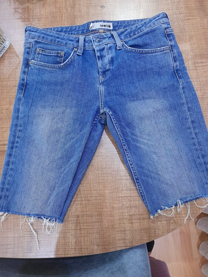 Kadınlar için regular fit, mini boy, desen içermeyen mavi denim şortlar. Günlük kullanım için rahat ve şık, kenarları hafif yıpranmış.