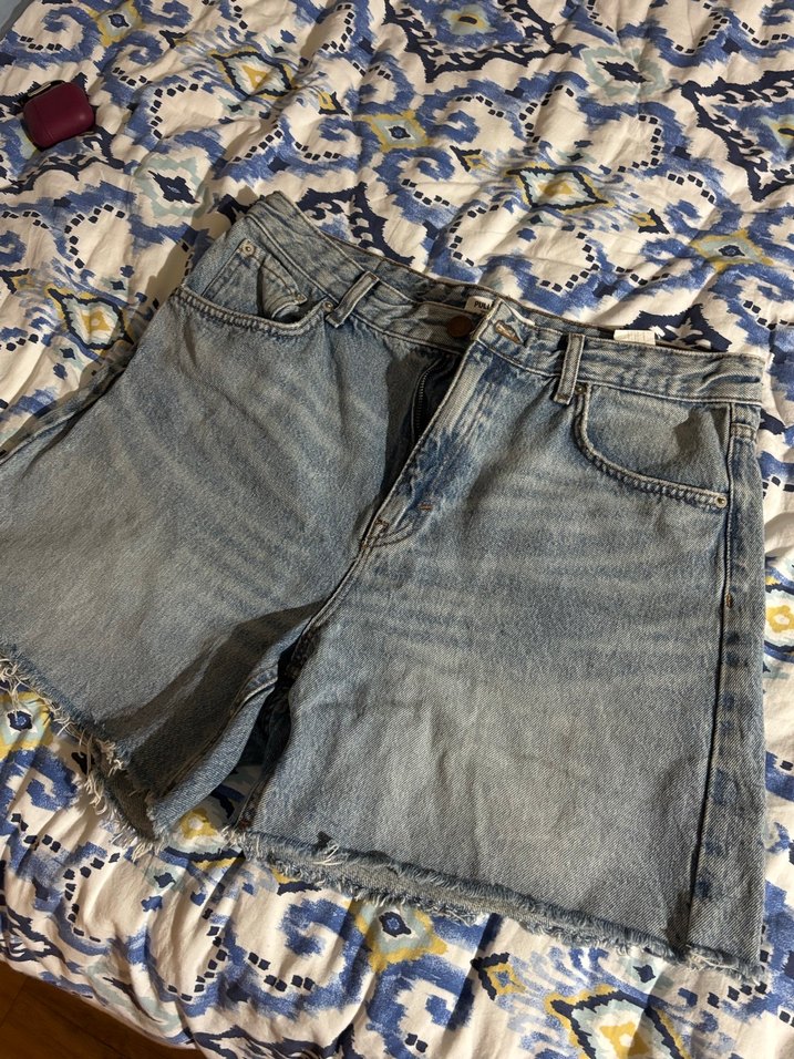 Mavi-gri tonlarda, düğmeli ön yüzlü, bol kesim mini kot şort, günlük sokak stili için uygun.