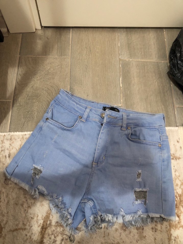 Ürün hediye geldi ve hiç giyilmedi. Bol kesim, pastel mavi mini kot şort, tokalı detay ve yırtık kenarlarla günlük sokak stili için uygundur.
