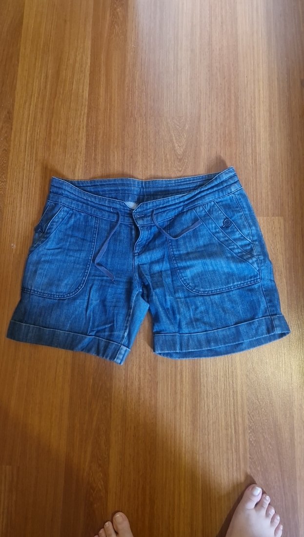 Mavi renkte, kemerli ve bol kesim mini kot şort. Dış mekan kullanımı için uygun, desen içermeyen sade tasarıma sahiptir.