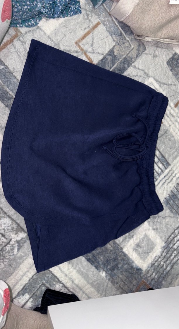 Kadınlar için mavi renkli, yumuşak ve sıcak kumaştan rahat kesim mini şort, elastik bel ve bağcık detaylı, dış mekan kullanımı için uygun.