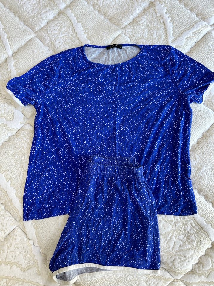 Kadınlar için bol kesim, kısa kollu ve mini boy şortlu koyu mavi pijama takımı. Rahat ve günlük kullanıma uygun bir stil sunar. ️