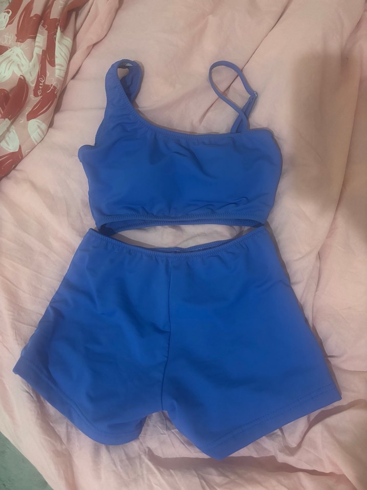 Kadınlar için koyu mavi, ince askılı ve mini şortlu, rahat ve şık bir mayo takımıdır.