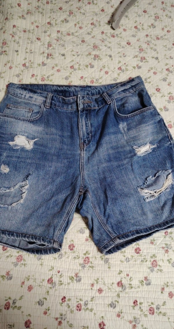 Kadın mavi kot şort, bol kesim ve mini boyda. Tokalı bel ve yırtık detaylara sahip, rahat ve günlük sokak stili için ideal.