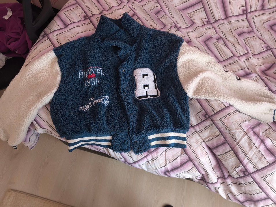 kadın için uzun kollu, bol kesim, yumuşak örme kumaştan yapılmış koyu mavi nakışlı polar ceket. Spor ve günlük kullanıma uygun, bisiklet yaka ve streetwear tarzında.