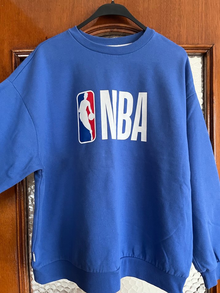 Mavi renkli, yuvarlak yakalı ve bol kesim uzun kollu sweatshirt. Yumuşak kumaştan üretilmiş, parlak NBA baskısı bulunur. Spor şıklığı sunar. Son fotografta defosu gösterilmiştir