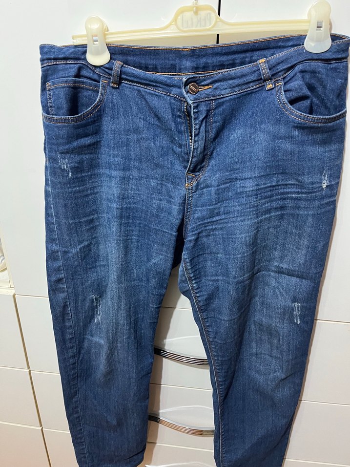 Mavi denim kumaştan, normal boy ve regular fit kesime sahip. Tokalı detay ve parlak görünümlü, günlük kullanıma uygun bir pantolon.