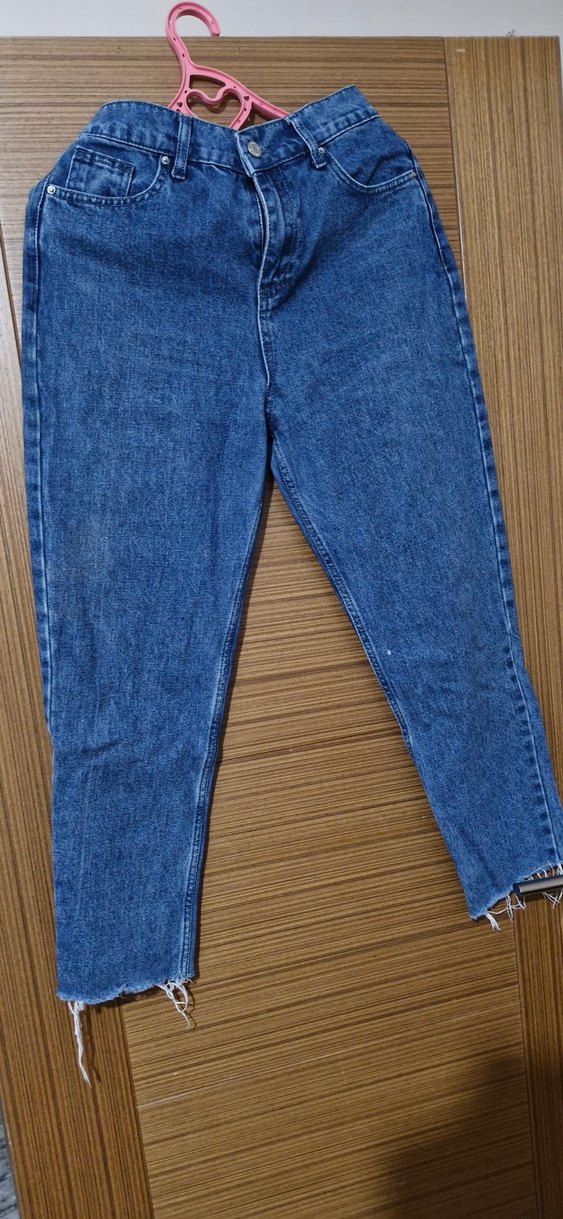 Mavi denimden üretilmiş, normal kesim ve midi boy kadın pantolon. Desensiz ve parlak görünümlü, gündelik kullanıma uygun şık bir model.