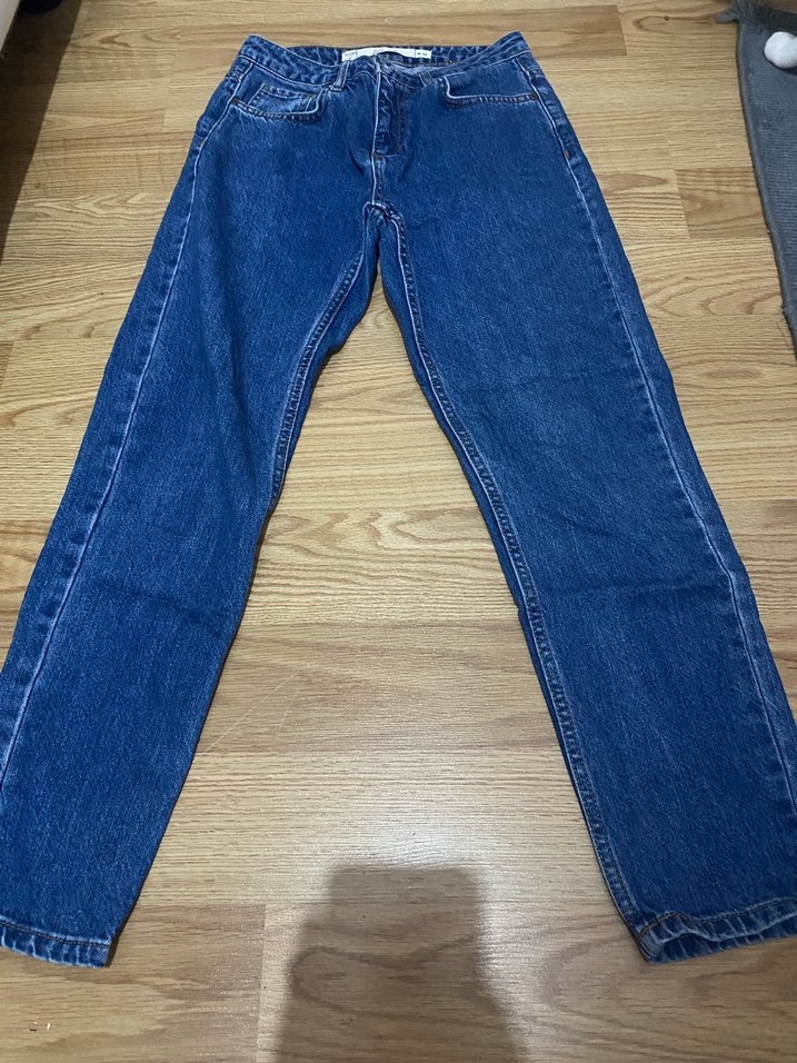 Parlak mavi renkte, normal kesim, midi boy, sade ve minimal tarzda kadın denim pantolon. Günlük kullanım için uygundur.