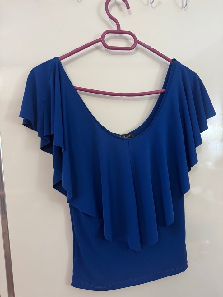 Kadınlar için fitted kesim, kayık yaka ve fırfırlı detaylara sahip, kolsuz mavi bluz. Sentetik kumaştan üretilmiş, baskılı ve günlük sokak stiline uygun.