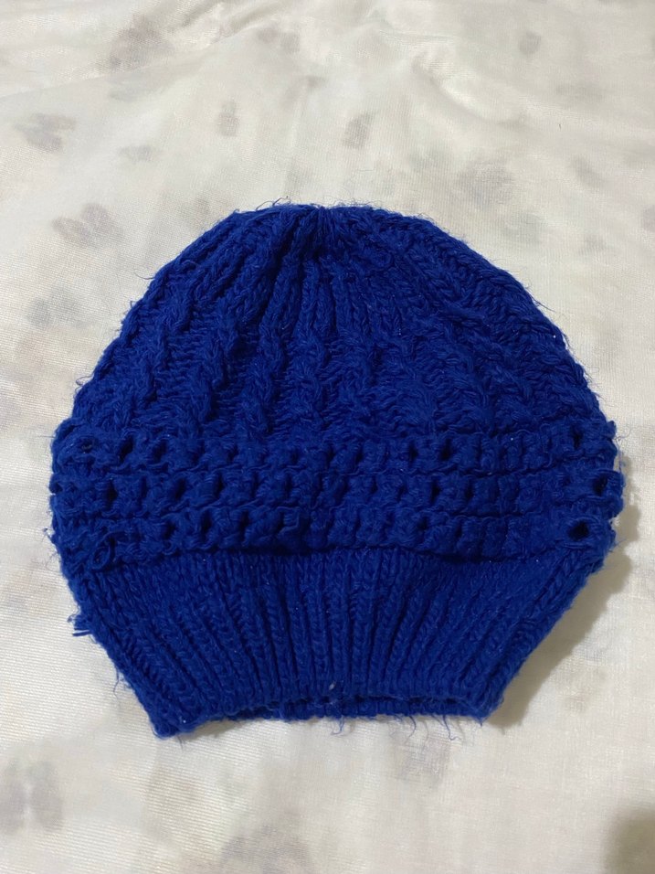 Kadınlar için örgü, yumuşak iplikten yapılmış canlı mavi renkte, rahat ve sade bir bere.