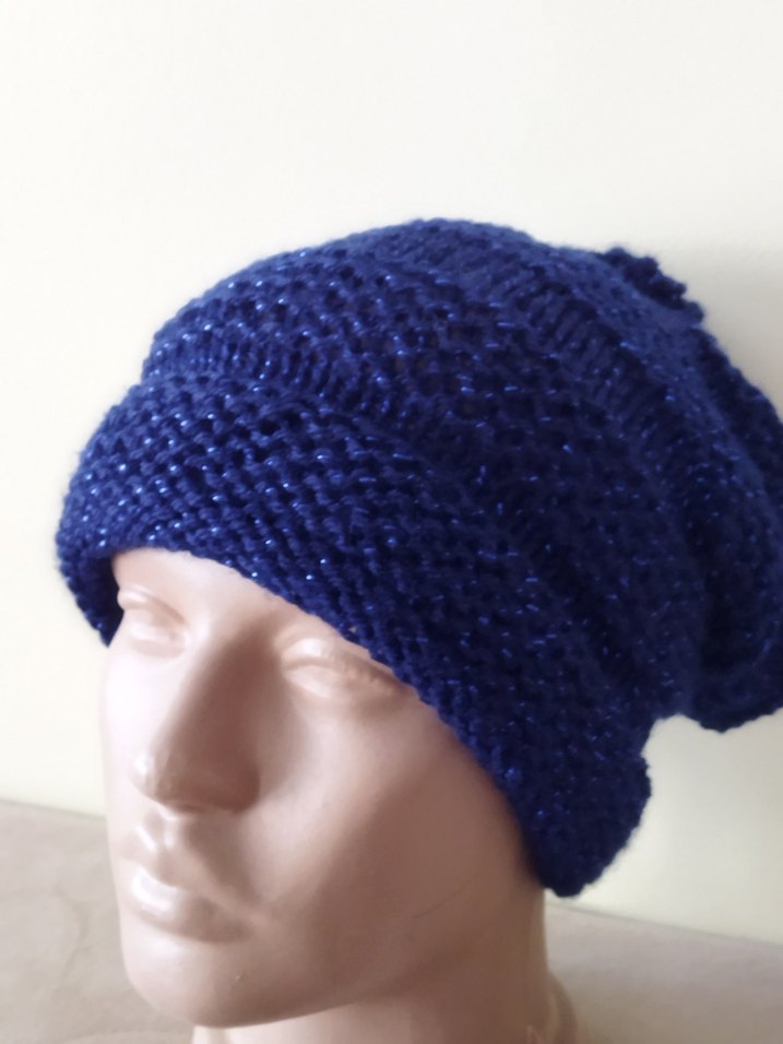 Kadınlar için örgü tasarımlı, canlı mavi renkte, rahat ve sade bir bere.