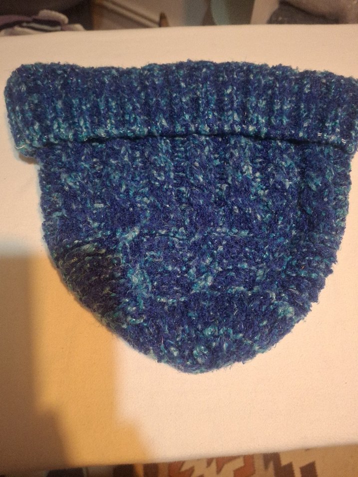 Kadınlar için koyu mavi renkte, yumuşak örgü kumaştan yapılmış, rahat ve hafif nostaljik tarzda bere.