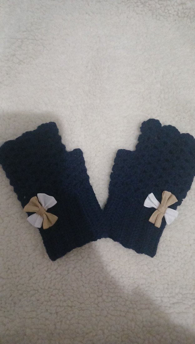 Koyu mavi örgü kadın eldivenler, rahat dokusu ve süslü fiyonk detaylarıyla dikkat çekiyor.