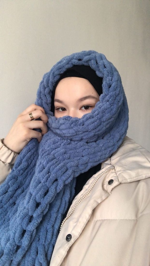 Kadınlar için pastel mavi renkte, örgü dokulu, rahat ve sıcak tutan şal. Modest tarzda sokak giyimine uygun yumuşak örgü kumaştan yapılmıştır.