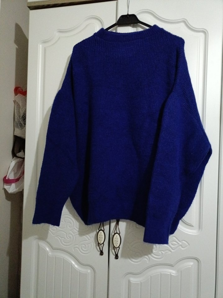 Kadınlar için koyu mavi renkli, örgü kumaştan yapılmış, yuvarlak yakalı ve uzun kollu salaş kesim kazak. Günlük kullanıma uygun sade, sokak tarzı kazak.
