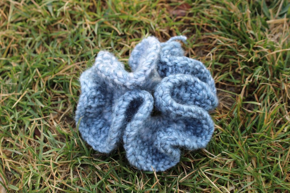 Yumuşak, gri-mavi dokulu örgü kadın toka, dalgalı tasarımıyla bohem tarzlara ve açık hava kullanımlarına uygundur.