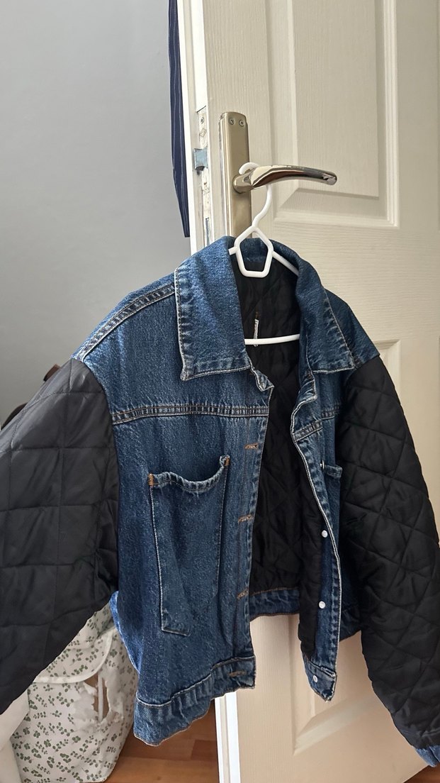 Kadınlar için mavi denim ceket, oversize kesim, çıtçıtlı ve yakalıdır. Siyah kapitone kollu, günlük kullanıma uygun sokak stili ceket.