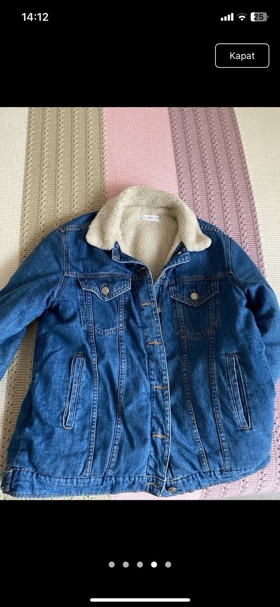 Mavi kot ceket, düğmeli ve uzun kollu, rahat yumuşak tüy yakalı. Oversize kesim ve normal boyda, günlük sokak stili için uygun. Çok az kullanıldı