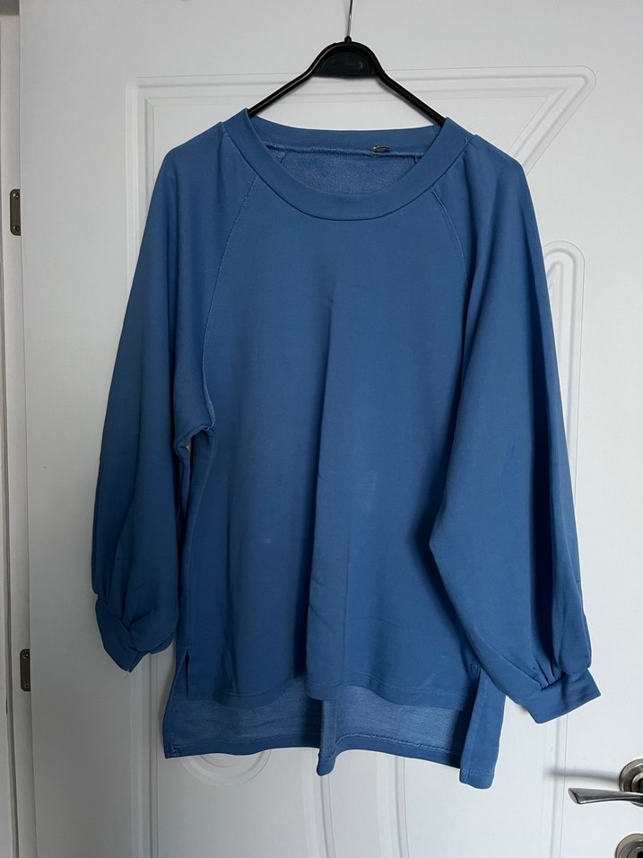 Kadınlar için yumuşak ve sıcak kumaştan, yuvarlak yakalı ve uzun kollu, bol kesim mavi sweatshirt. Desensiz, günlük kullanıma uygun.