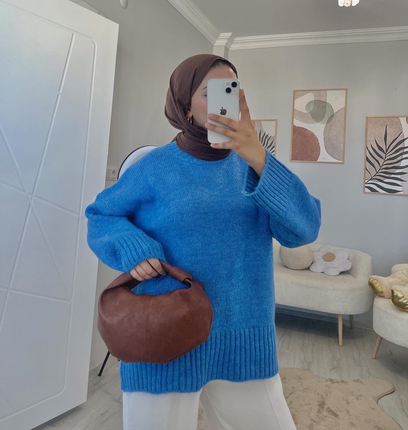 Geçmeli yaka ve uzun kollu, mavi oversize triko kazak. Midi uzunlukta, rahat ve şık günlük sokak stili için ideal.