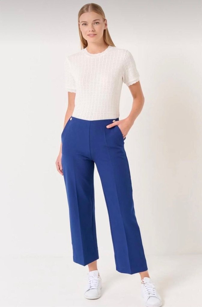 Kadınlar için açık mavi pamuk pantolon, normal kesim ve midi boyda. Ofis için uygun, rahat ve zahmetsiz şıklık sunar.