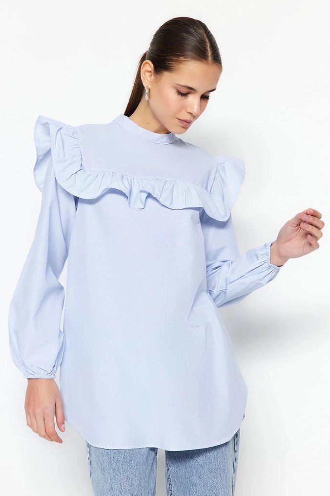 Kadınlar için bol kesim, yüksek yakalı ve göğüs kısmında fırfır detaylı gömlek. Yumuşak pamuktan, pastel mavi renkte, günlük rahat normcore tarzda. Uzun kollu ve normal boyda.