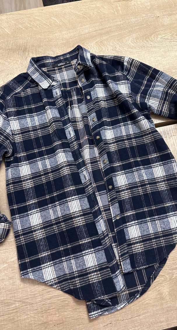 Pamuklu kumaştan, düğmeli önü ve uzun kollu, kesik yakalı, bol kesim kadın mavi kareli gömlek. Rahat sokak stiline uygun.