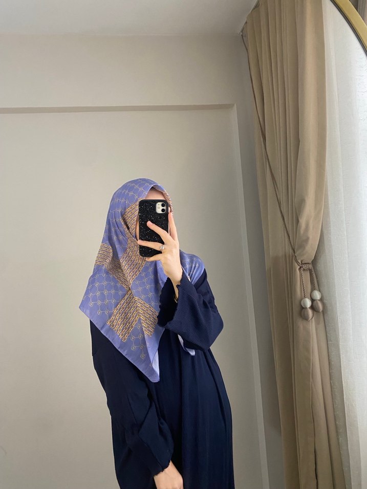 Kadınlar için koyu mavi renkte, saten dokulu ve drapeli tasarıma sahip eşarp , sade ve modern bir görünüm sunar.