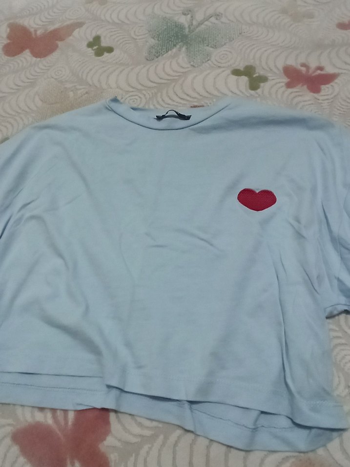 Pamuklu, mavi renkli, kısa kollu ve yuvarlak yaka kız çocuk tişörtü. Salaş kesimi ve küçük kırmızı kalp baskısı ile rahat ve şık bir sokak stili sunar.